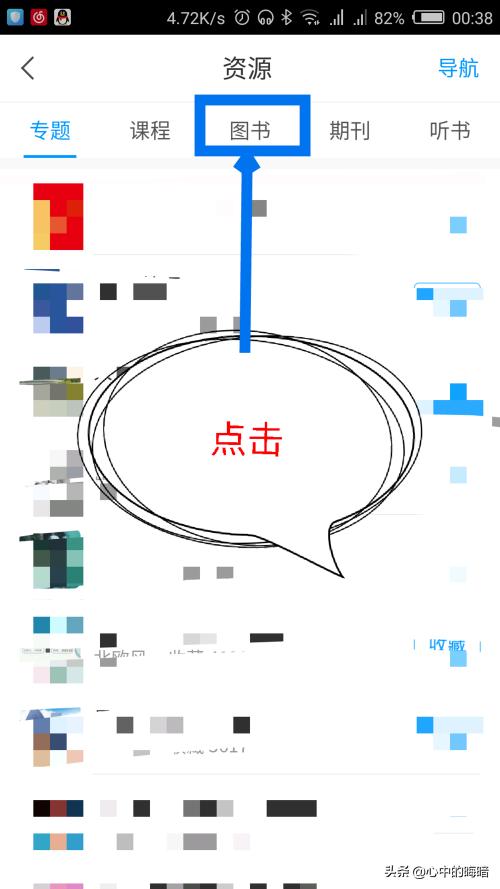 打开资源界面后,在顶部的菜单选项中,点击图书选项。如图所示
